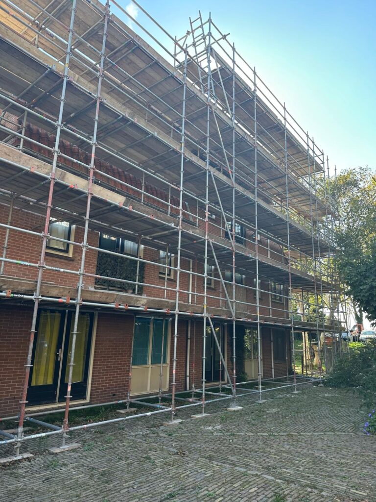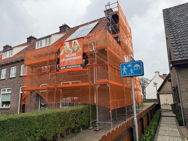 Voor extra veiligheid en bescherming van de omgeving hebben wij 50% steigergaas toegepast, waardoor het werk veilig kan plaatsvinden zonder dat de uitstraling van het pand volledig wordt afgesloten. Dankzij onze vakkundige montage kon het project snel en probleemloos worden uitgevoerd.
